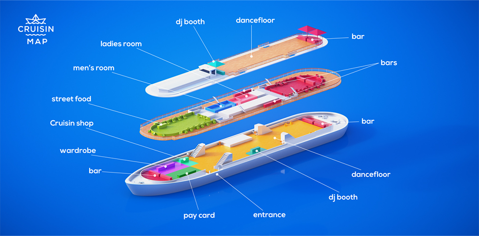 A hajón nem fogsz unatkozni. Fogsz enni, inni, zenét hallgatni, táncolni és persze várost nézni. A tánchoz pedig egy akkora táncteret kapsz, amekkorán még talán sosem partiztál eddig.