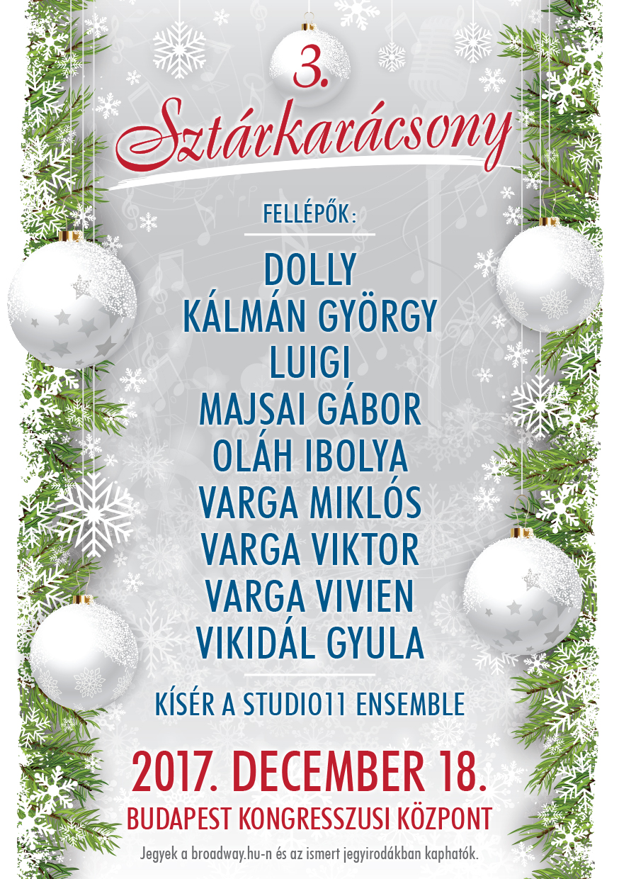 A karácsony elképzelhetetlen lenne azok nélkül a tradicionális és modern ünnepi dalok nélkül, melyeket a legnépszerűbb énekesek közvetítésével egy csokorba szed nekünk a Sztárkarácsony koncert. Idén a fellépők között lesznek többek között: Dolly, Kálmán György, Luigi, Majsai Gábor, Oláh Ibolya, Varga Miklós és lánya, Varga Vivien, Varga Viktor valamint Vikidál Gyula. Az előadókat pedig a Stúdió 11 Ensemble zenekar kíséri.